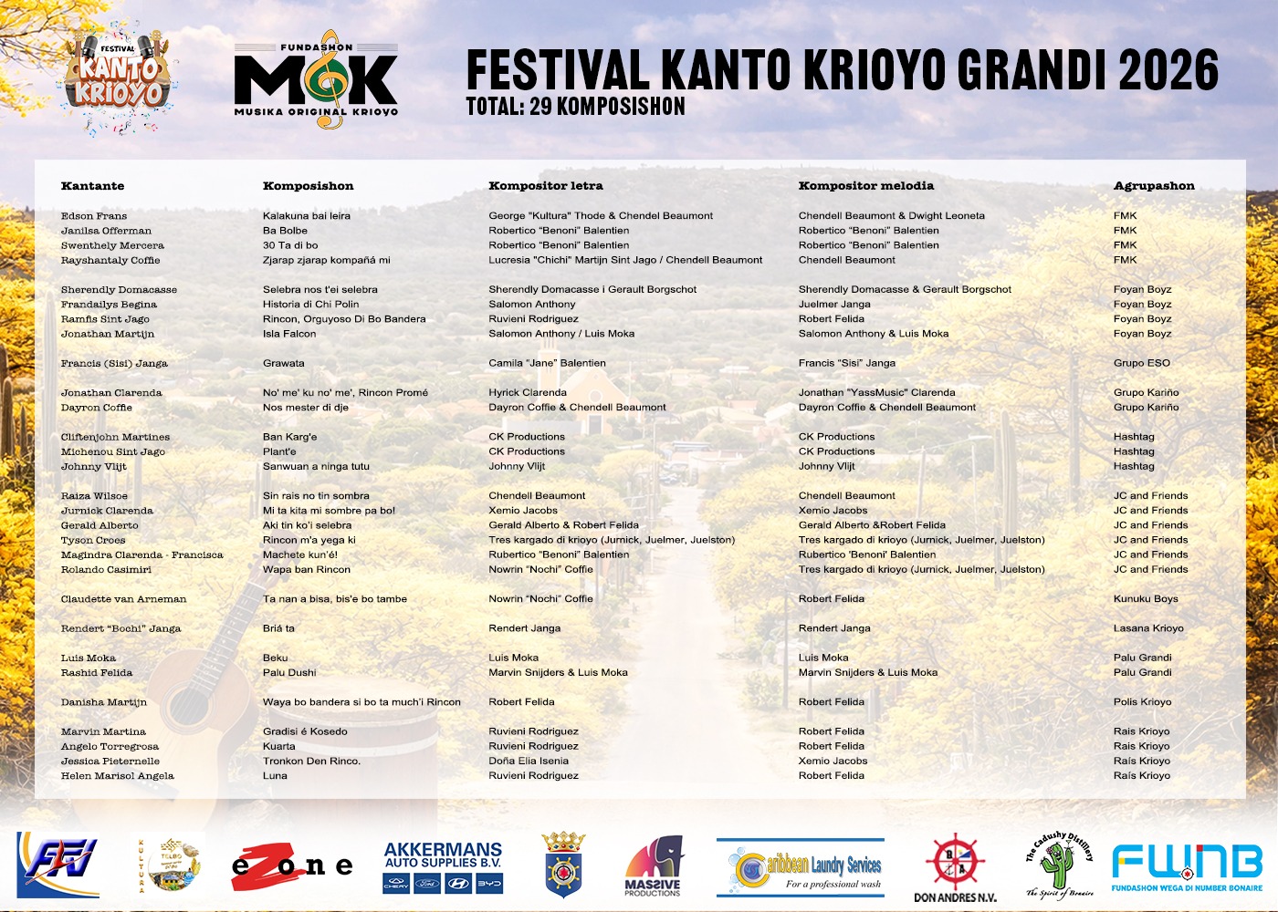 22 di mart anochi, den un ambiente alegre i ameno den Rincon, tabatin e tan sperá inskripshon pa kanto krioyo 2026. E festival, ku ta esun mas grandi den nos komunidat, ta konta ku e aña aki un total di 29 komposishon grandi i 13 komposishon hubenil. Esaki ta reflehá ku interes di nos artistanan pa e evento aki ta sumamente altu.